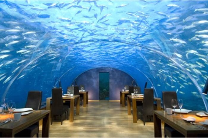 Don’t miss the Ithaa Underwater Restaurant on Conrad Island to enjoy eating in the company of lovely marine creatures moving in the surrounding water. This is often voted world’s best restaurant.